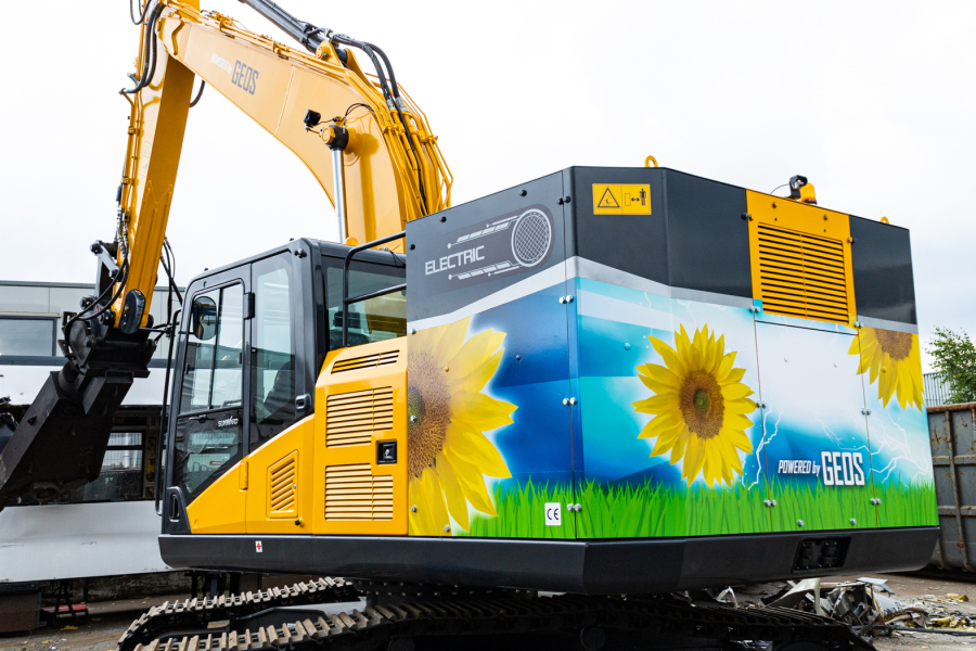 GEOS: Green Energy On Site is een totaalconcept van oplader, mobiel accupakket en elektrische minigraver en rupsgraafmachine die volledig af fabriek geproduceerd en ontwikkeld zijn. Laat u verbazen door de lange werktijd en de korte laadtijd van deze 2 en 24 tons graafmachines, powered by GEOS. De Zonnekoning biedt u groene stroom op elke gewenste locatie! 60m² zonnepanelen die meedraaien met de stand van de zon zorgen voor een maximale opbrengst van zonne-energie.
