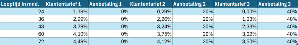 - De financieringstarieven die gelden op het moment van contractafsluiting zijn van toepassing.