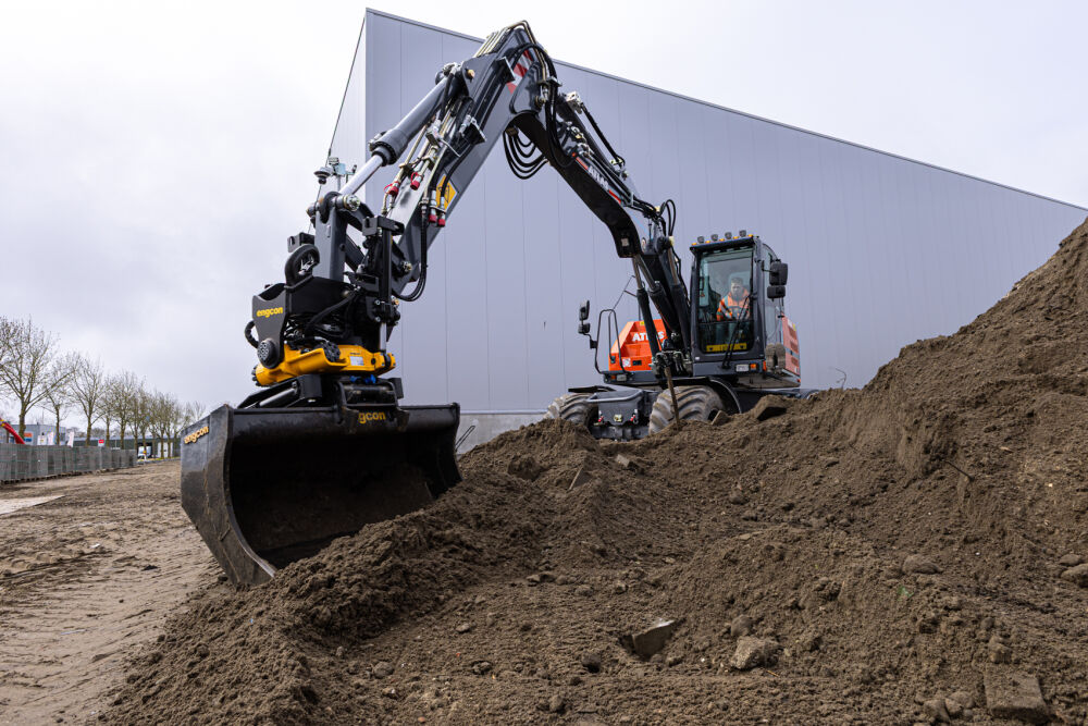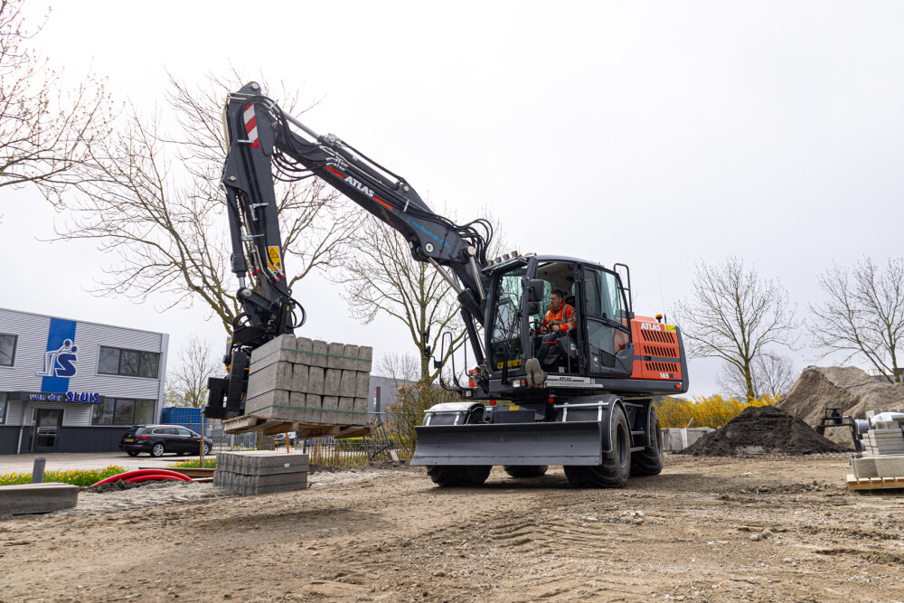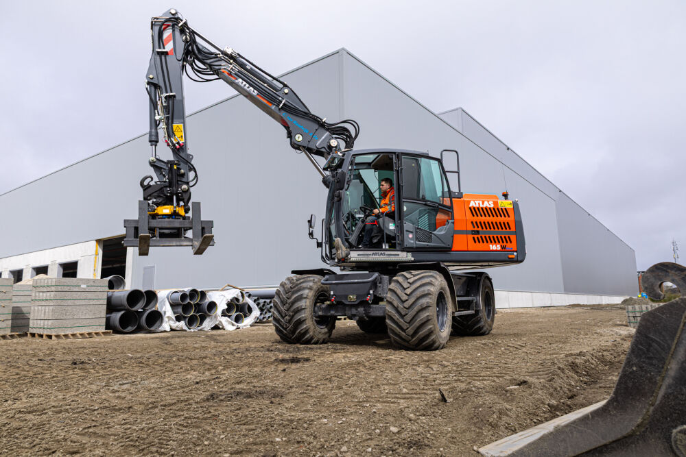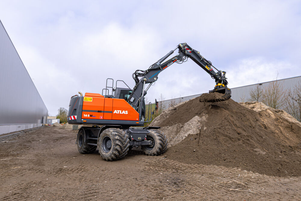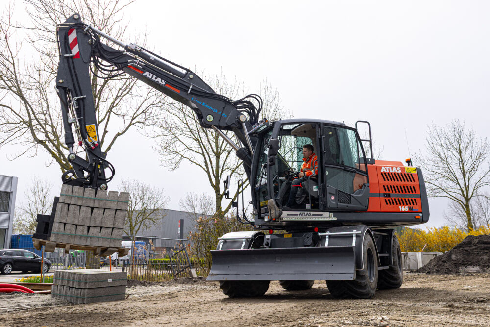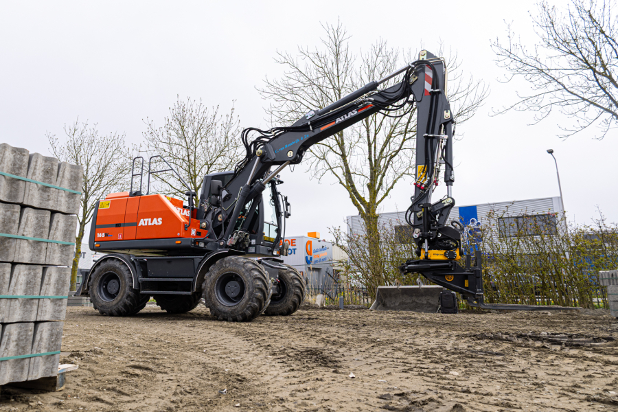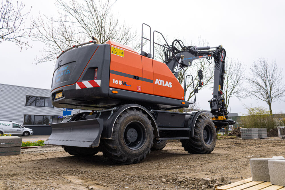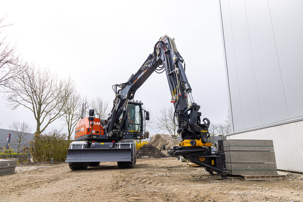 Deze Atlas 165W is door Kemp Groep uitgerust met een Engcon EC219 draai/kantelstuk met grijpermodule en DC2 besturing, Alliance banden met trekkerprofiel en kunststof spatborden. De machine is voorzien van dansonderdrukking op de grondarm, een lekolieleiding en voor extra zicht is er een derde camera geplaatst aan de punt van de knikarm.