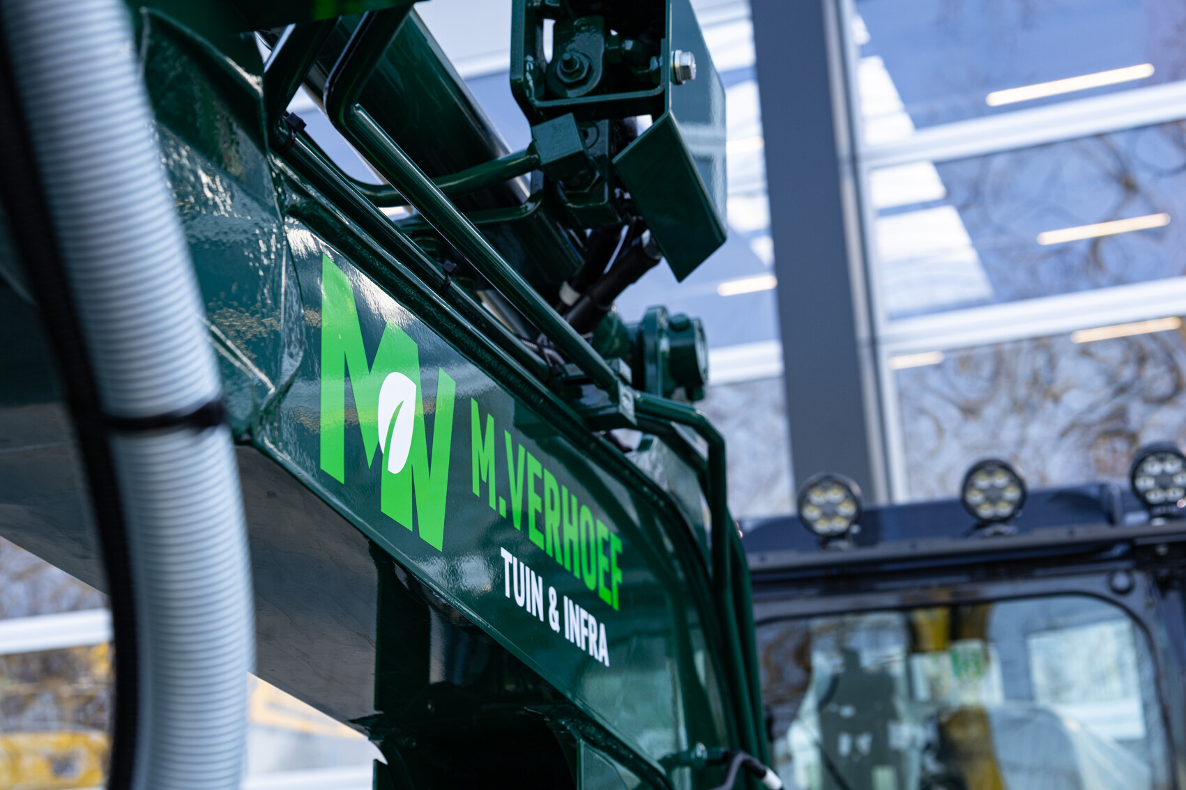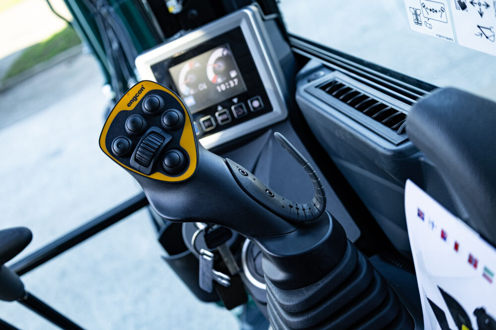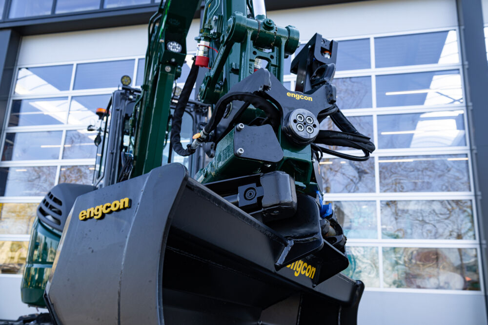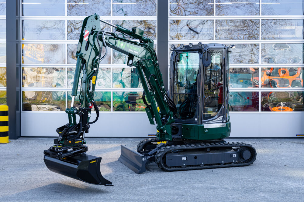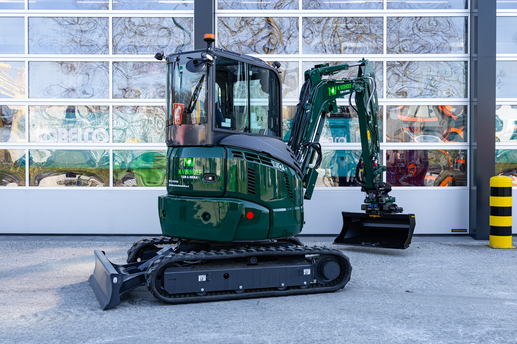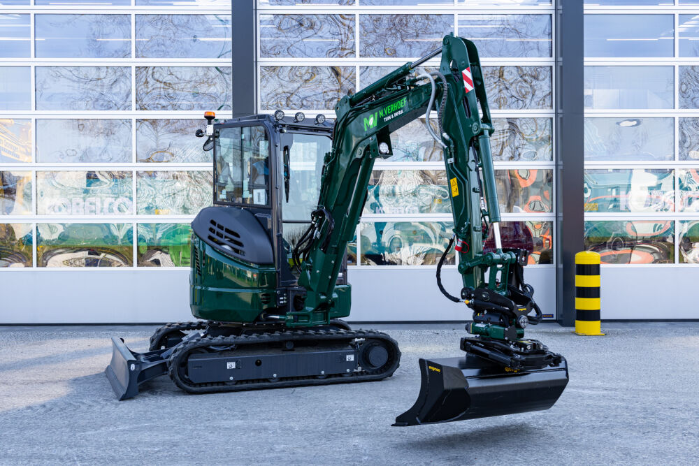 De Kobelco SK28SR-7 is door Kemp Groep voor M. Verhoef Tuin & Infra uitgerust met een Engcon draaikantelstuk met grippermodule, een extra contragewicht van 250 kg, extra werkverlichting en een veiligheidspakket. Daarnaast wordt de machine afgeleverd met allerlei uitrustingsstukken zoals een puinriek, banaanbak, graafbak, brede bak, palletvorken en een boomwortelmes. Voor een perfecte aflevering is de minigraver door Kemp Groep voorzien van professionele belettering.
