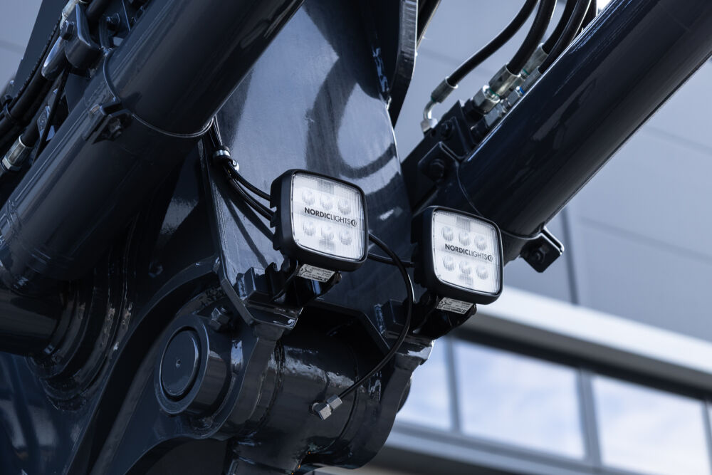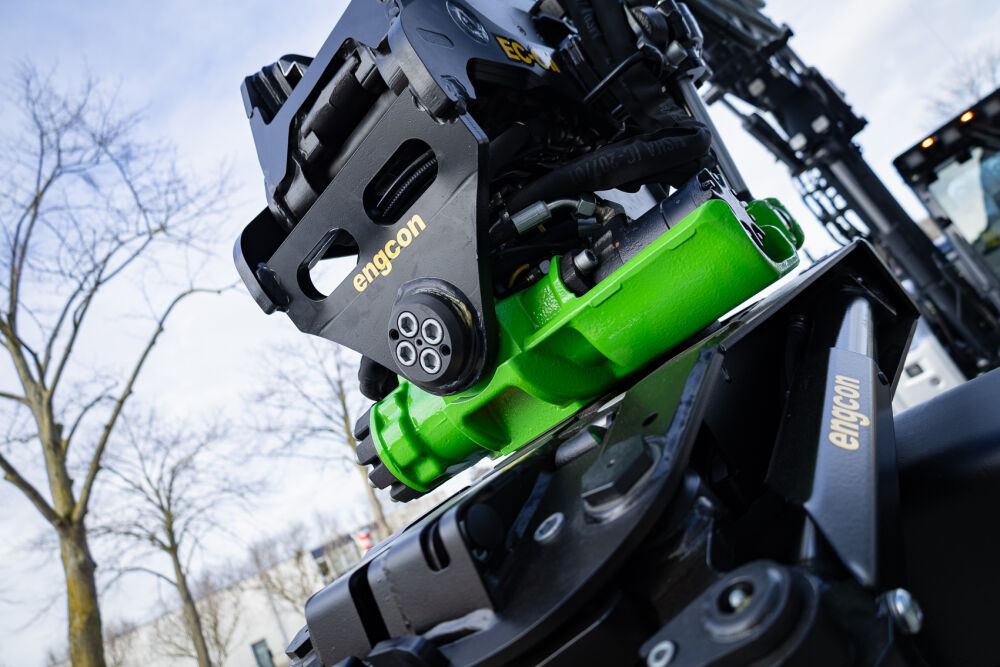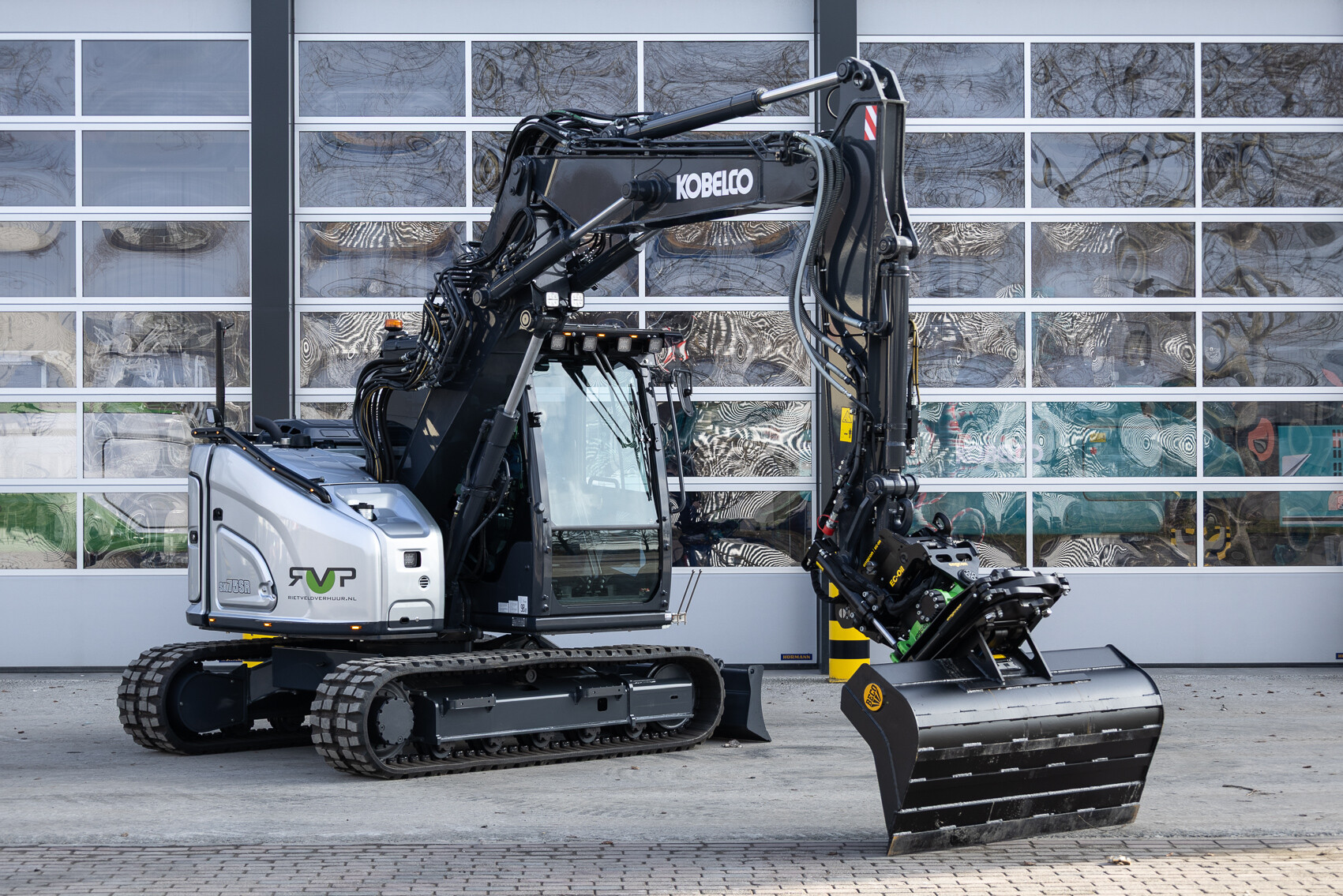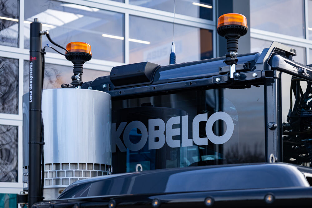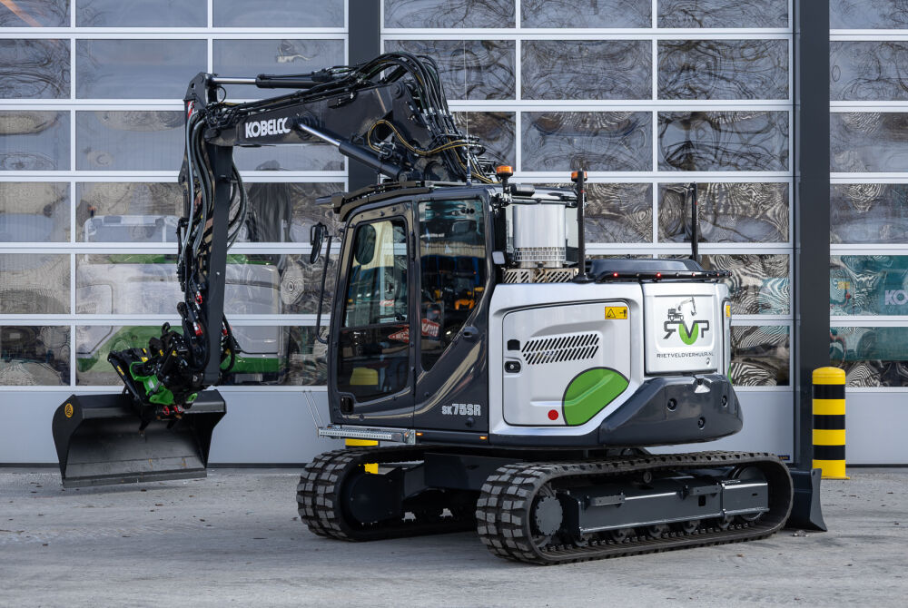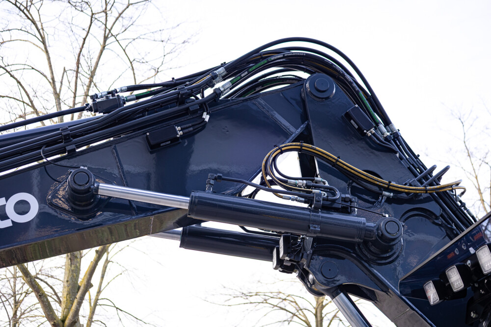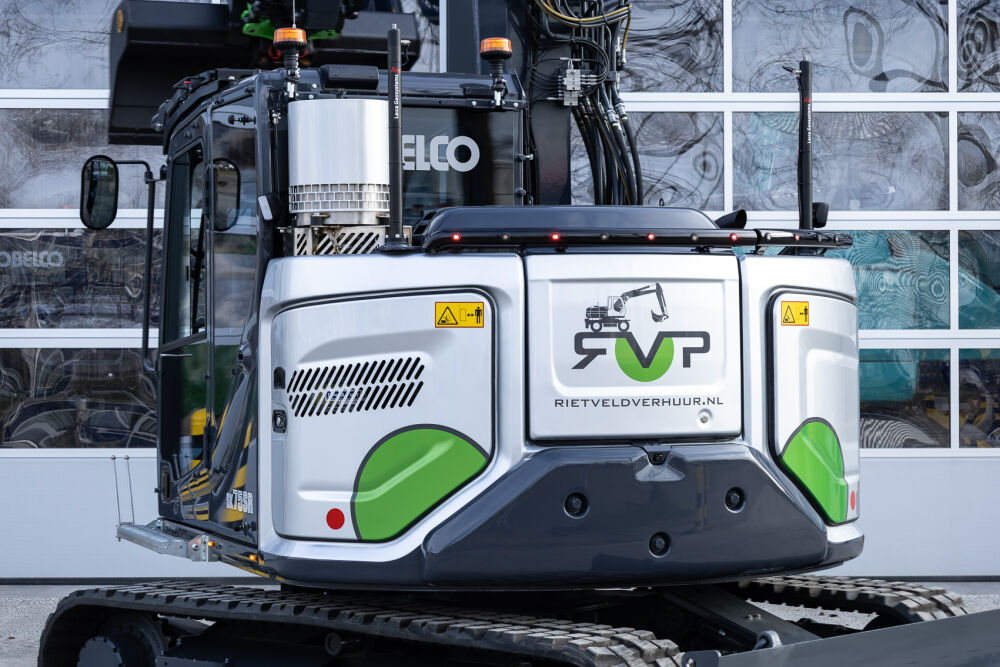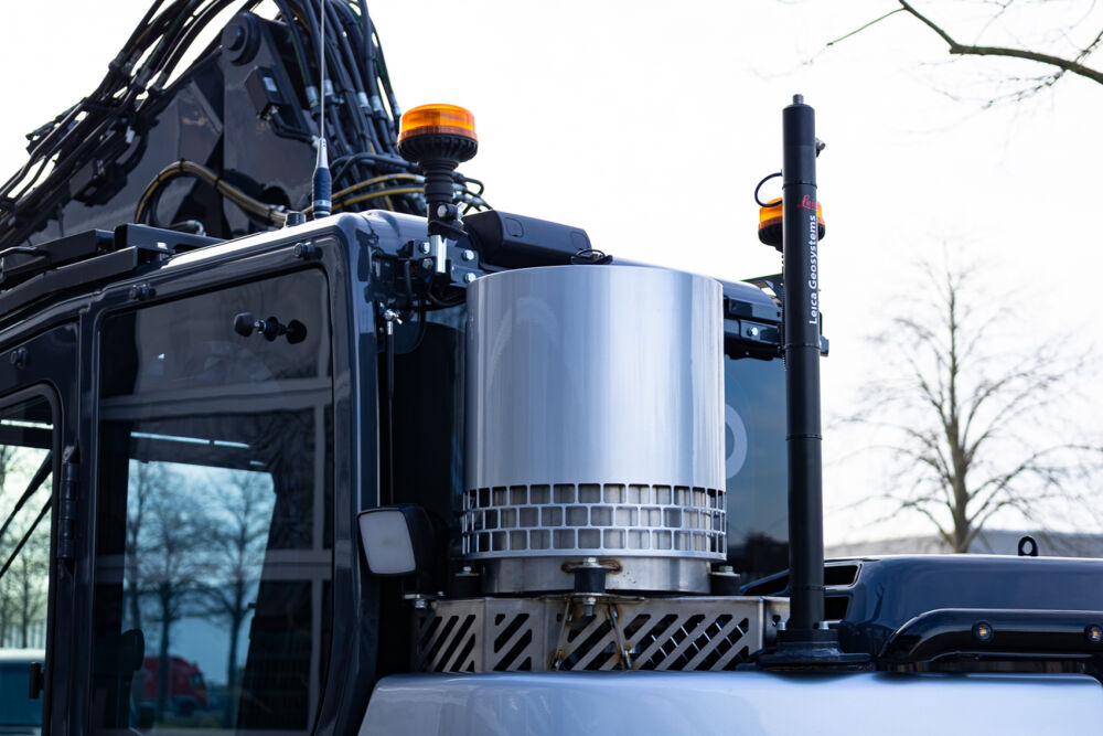 Ook is de machine voorzien van extra werkverlichting, een automatisch smeersysteem, een FreshFilter overdruksysteem en een startonderbreker. Daarnaast is er gekozen voor comfort- en afwerkingsopties zoals een opklapbare treeplank bij de cabinedeur met klompenhaken, eengereedschapskist op de onderwagen 27MC, geblindeerde ruiten en MittX sierbeugels met contourlampjes. Tot slot is de machine volledig in de bedrijfskleuren gespoten, voorzien van belettering, voorbereid op Leica 3D GPS en geleverd met diverse uitrustingsstukken van Beco, waaronder een brede bak, graafbak, banaanbak en palletvorken.
